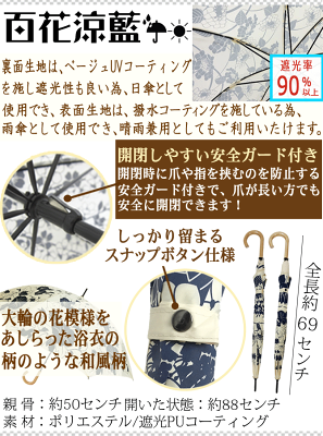 百花涼藍 和風日傘!綿混素材が上品で、お洒落なデザインが選べる3種類!涼しげな色合いで紫外線カット!浴衣の柄のようなデザインは、和装にはもちろん、洋装にも馴染みます!持ち手部分にお名前を彫刻するので、プレゼントにも最適です!※彫刻場所は、正面・右側面・左側面のどれかになります。
